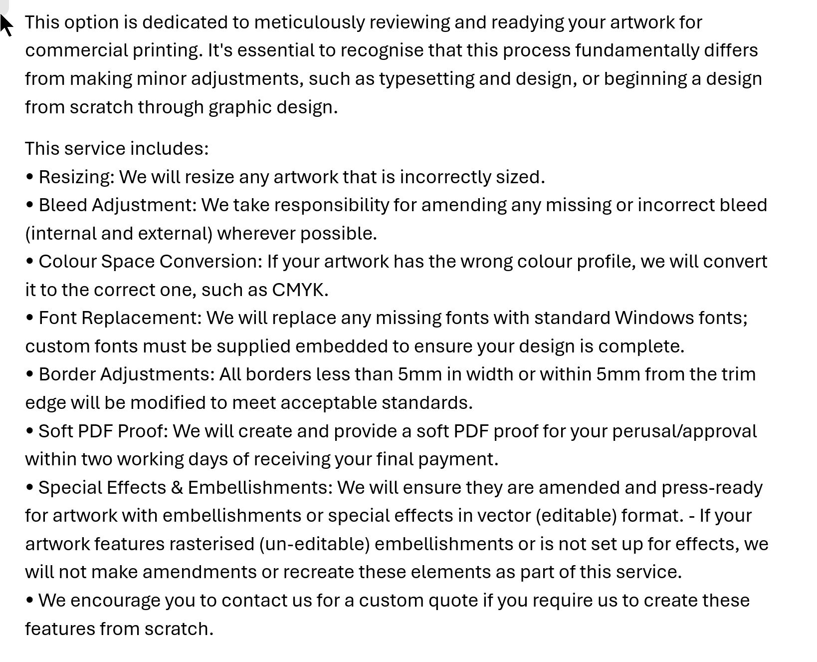 - Special Effects & Embellishments: We will ensure they are amended and press-ready for artwork with embellishments or special effects in vector (editable) format. - If your artwork features rasterised (un-editable) embellishments or is not set up for effects, we will not make amendments or recreate these elements as part of this service.